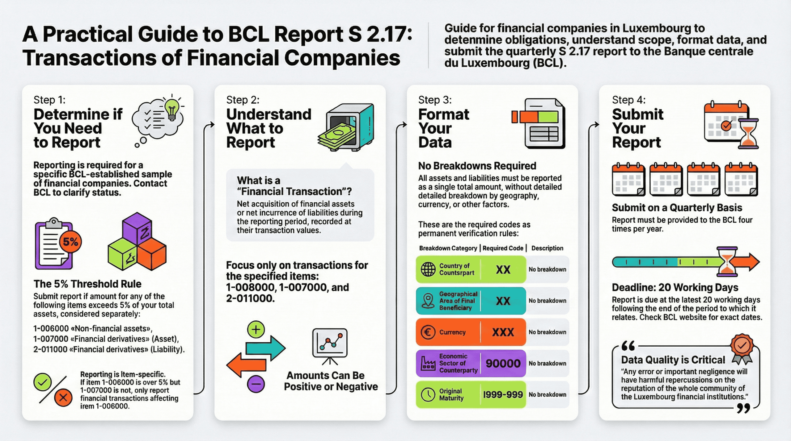 This briefing provides a comprehensive analysis of the Banque centrale du Luxembourg (BCL) statistical report S 2.17, “Transactions of financial companies.” The report is a quarterly data collection requirement for a select sample of financial companies, designed to provide the BCL and the European Central Bank (ECB) with information on transactions affecting specific balance sheet items.