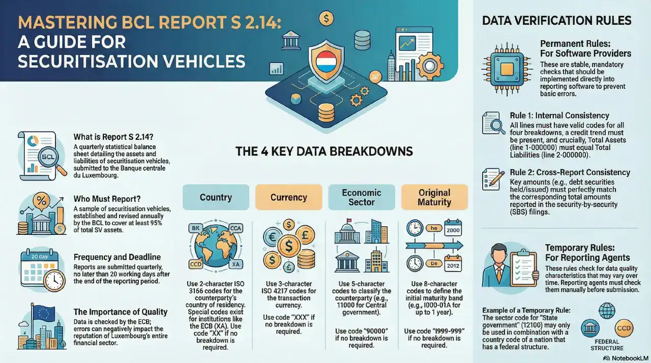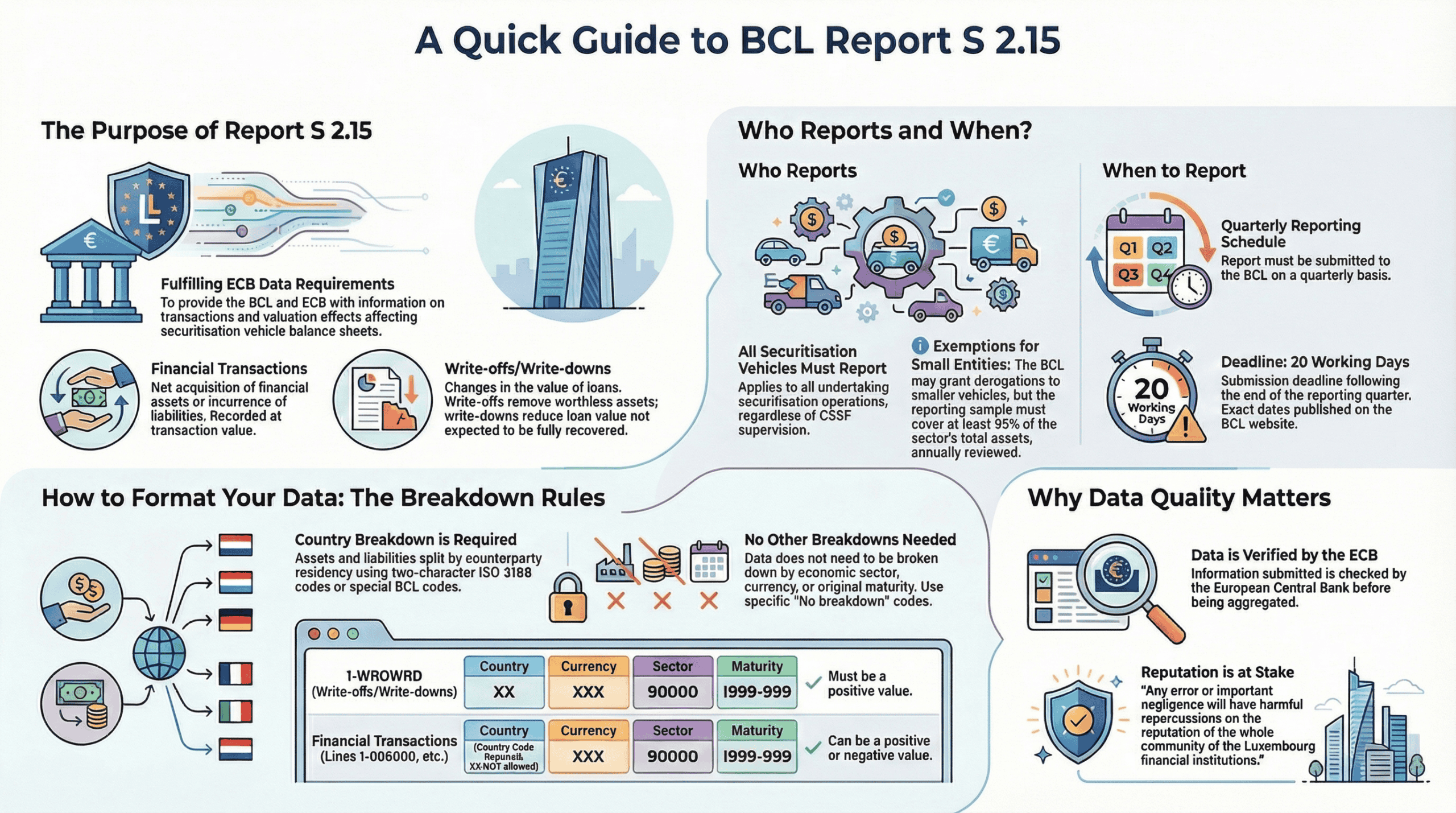 The Banque centrale du Luxembourg (BCL), in alignment with European Central Bank (ECB) directives, has established a multi-layered statistical reporting framework for Securitisation Vehicles (SVs). This framework is designed to provide comprehensive data on SV assets, liabilities, and transactions for analytical and research purposes.