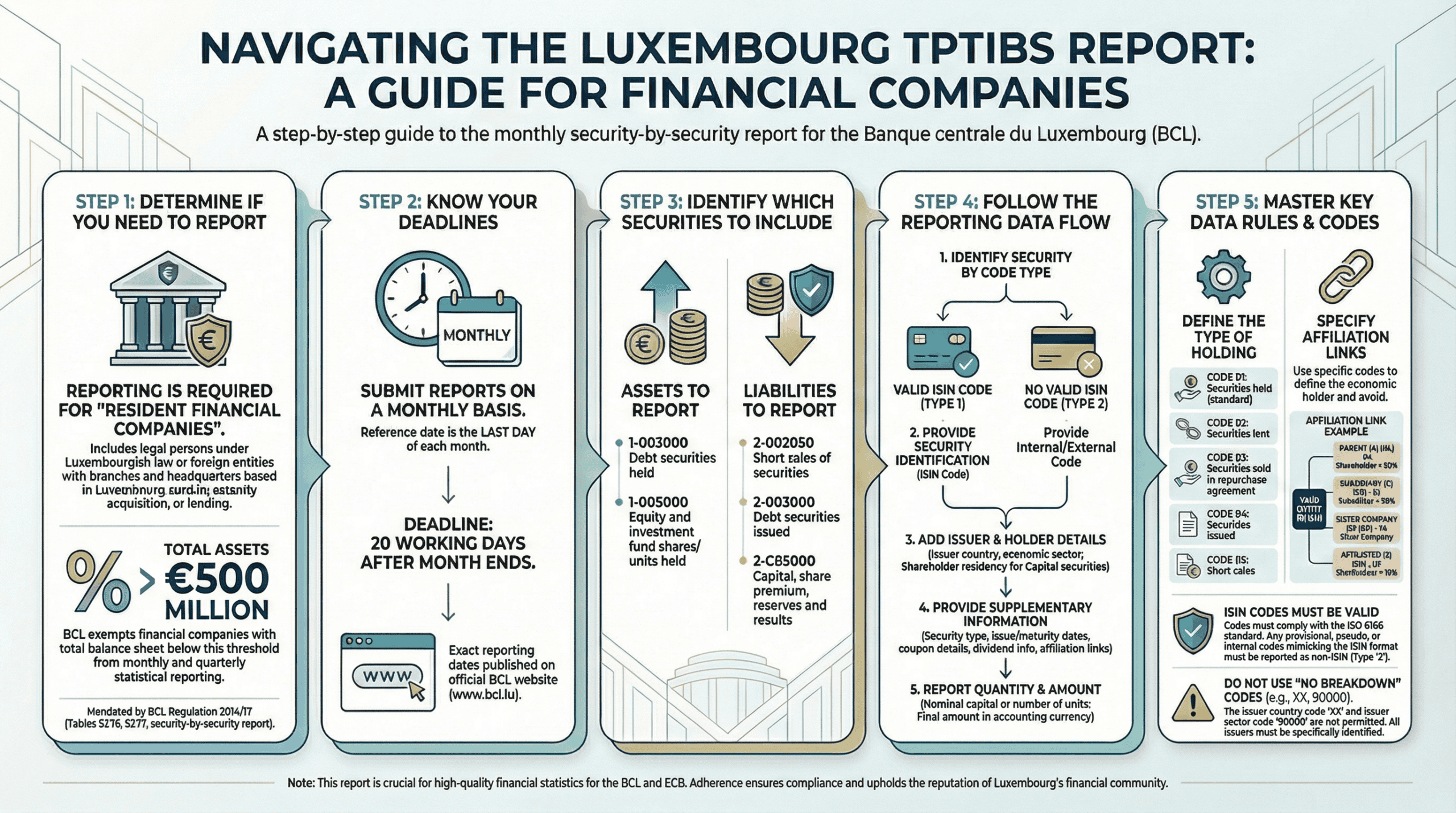 The TPTIBS report is a key statistical collection framework established by the Banque centrale du Luxembourg (BCL) under Regulation 2014/17. Its primary purpose is to gather highly detailed, security-level data from financial companies operating in Luxembourg. This compendium outlines the scope, requirements, and critical complexities of the TPTIBS framework.